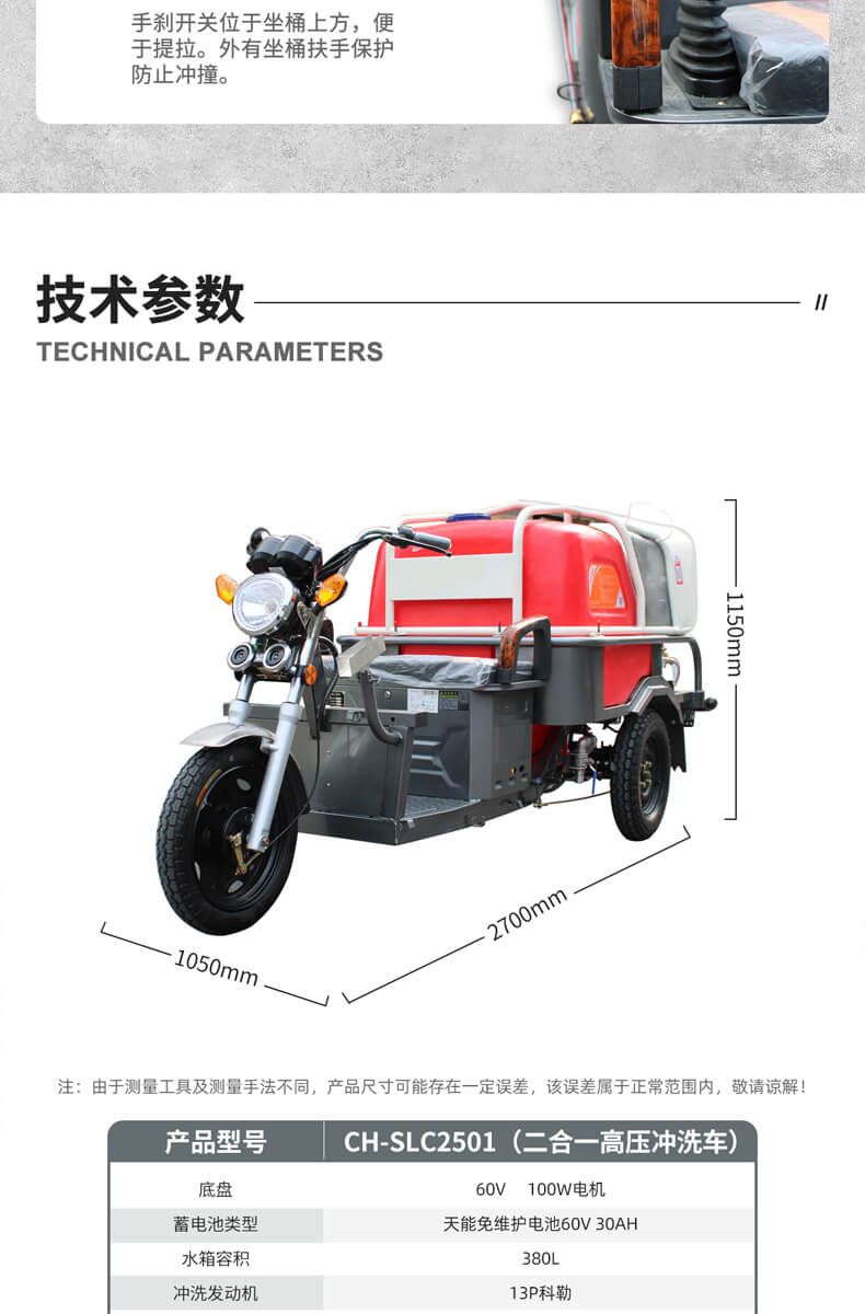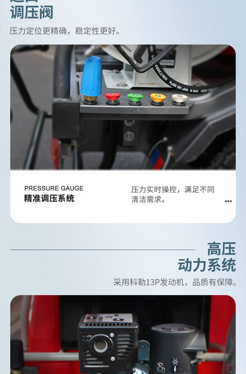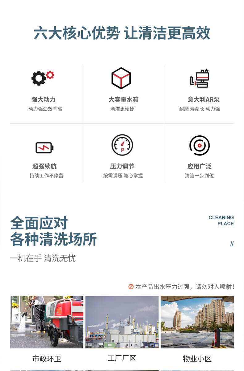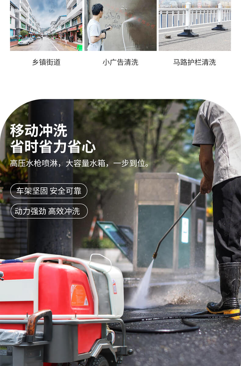 用途:此款二合一高压冲洗车,免维护锂电池,压力实时操控,满足不同清洁需求,进口调节阀压力定位更精确,稳定性能好。可全面应对各种清洗场所,如:市政环卫,工厂厂区,物业小区,乡镇道路,小广告清洗,马路护栏清洗。