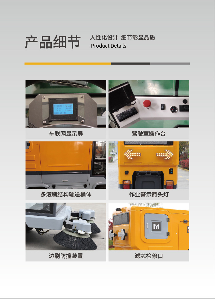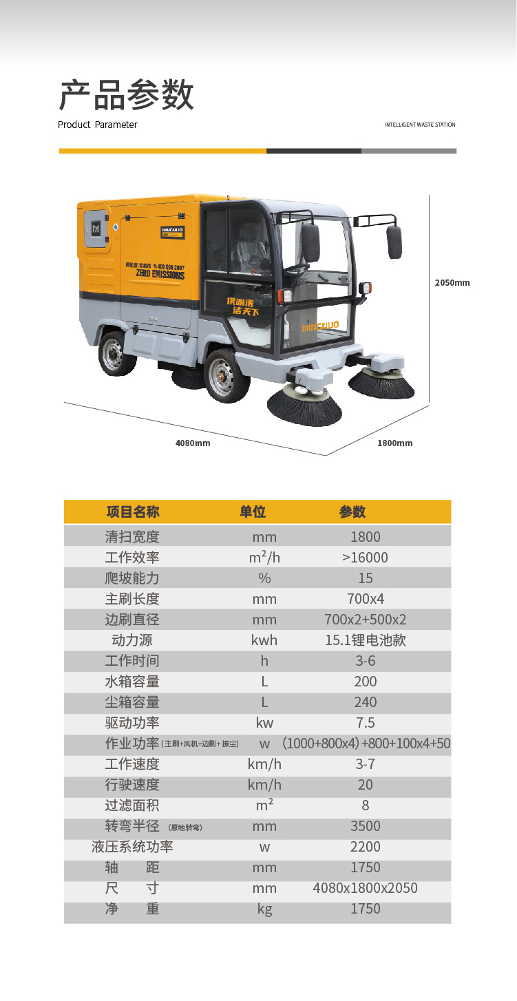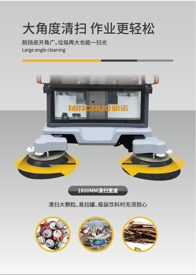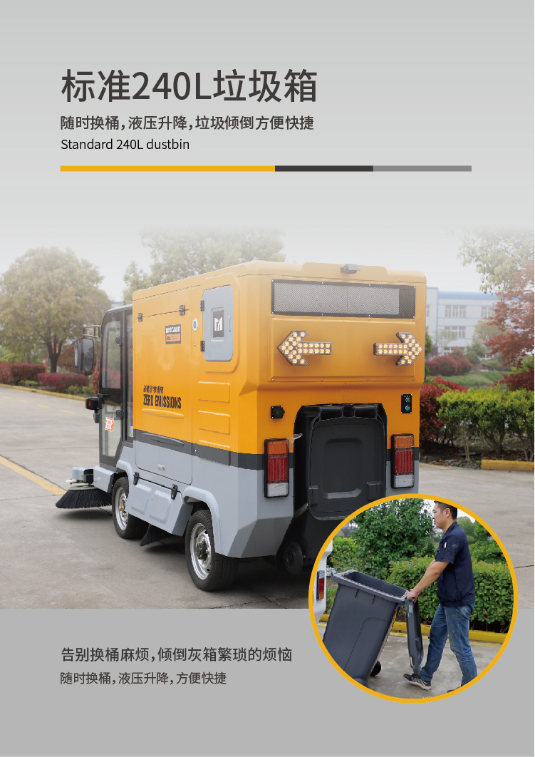 MN-S1800采用240L标准垃圾桶收集垃圾,液压升降,垃圾桶更换方便快捷。输送桶体采用多滚刷结构,结构新颖,具有能耗低,噪音小,易检修等优点。