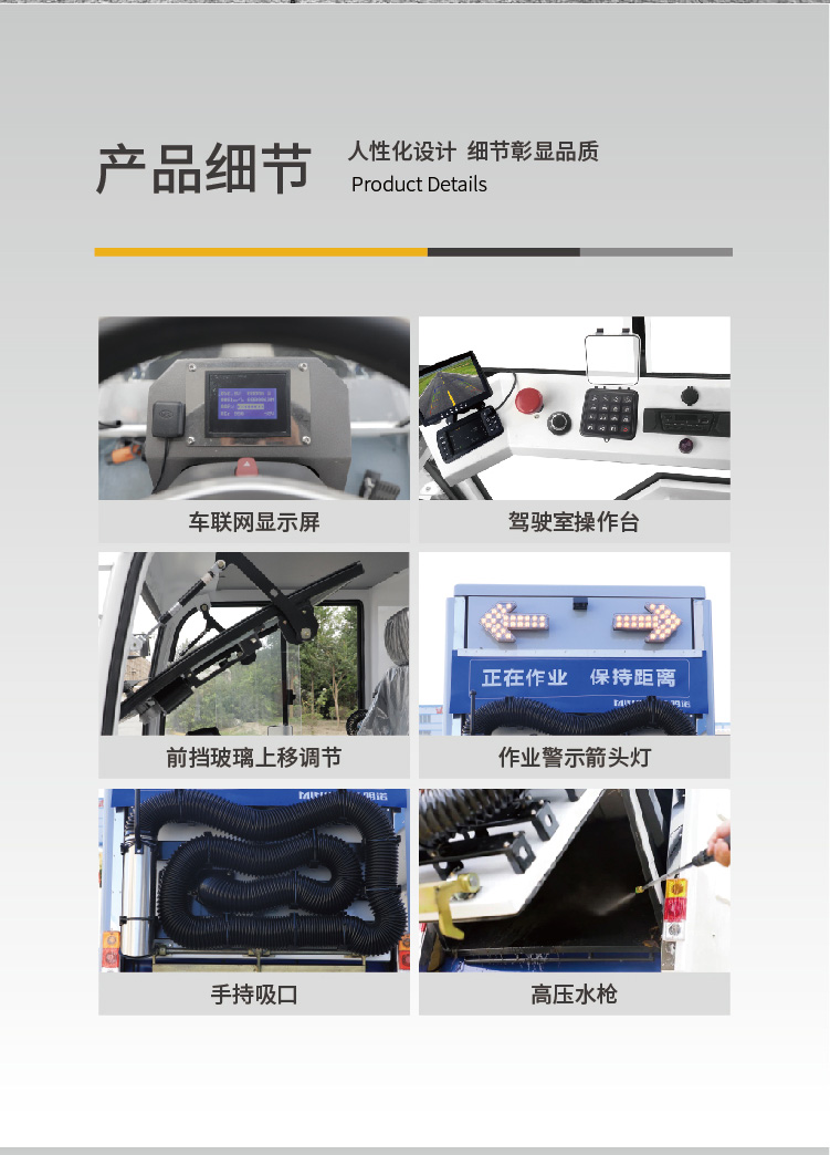 l 一立方超大容量垃圾箱,液压倾倒系统垃圾倾倒便捷。前置可调节盘刷,中置两盘刷及滚刷,清扫效果好。