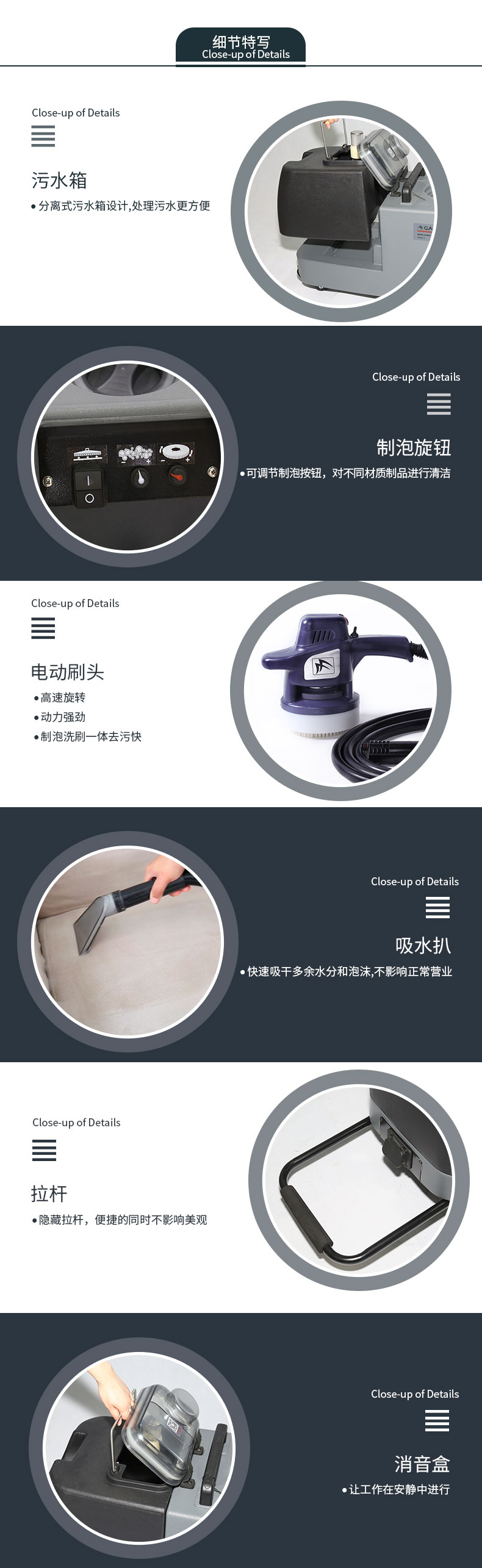 利用温热水喷射溶解污渍,同时将污水抽拔出并吸进污水箱,干燥迅速,2小时即可营业;可清洁中等面积地毯。适用于地毯商店、汽车美容、汽车经销商、办公室以及保洁公司。
