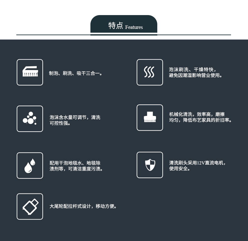 用途:广泛适用于餐饮、会所、酒店、影院等场所,清洗布艺家具和装饰的专业设备!