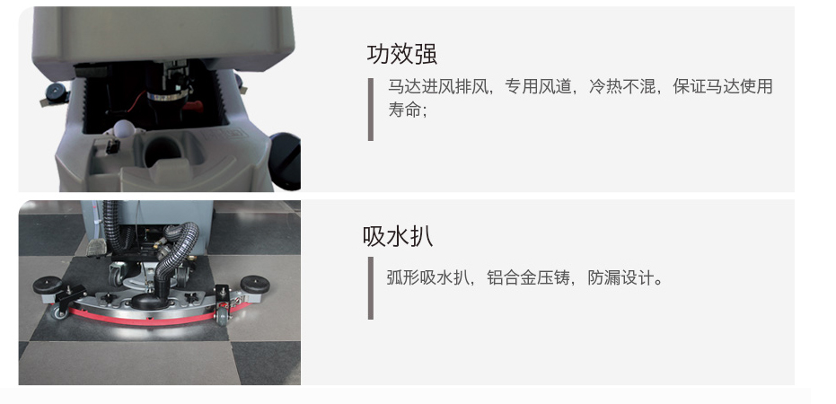 洗擦、吸干一次性完成,洗刷吸干过的地面,洁净如新,脏水、泥土、沙粒、油污统统吸入污水 箱。简化清洁工作,大大减少清洁劳累和作业时间;快速解决地面上的污垢,显著提高清洁卫生质量。特别适合500m2-1000m2场所使用。