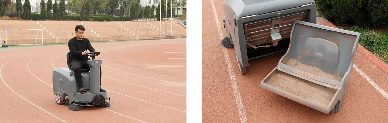 塑胶跑道,表面多为红色颗粒层,易产生胶粒、沙粒等异物,因表面凹凸且粘性大,清洁难度大,清洁和养护措施匮乏。