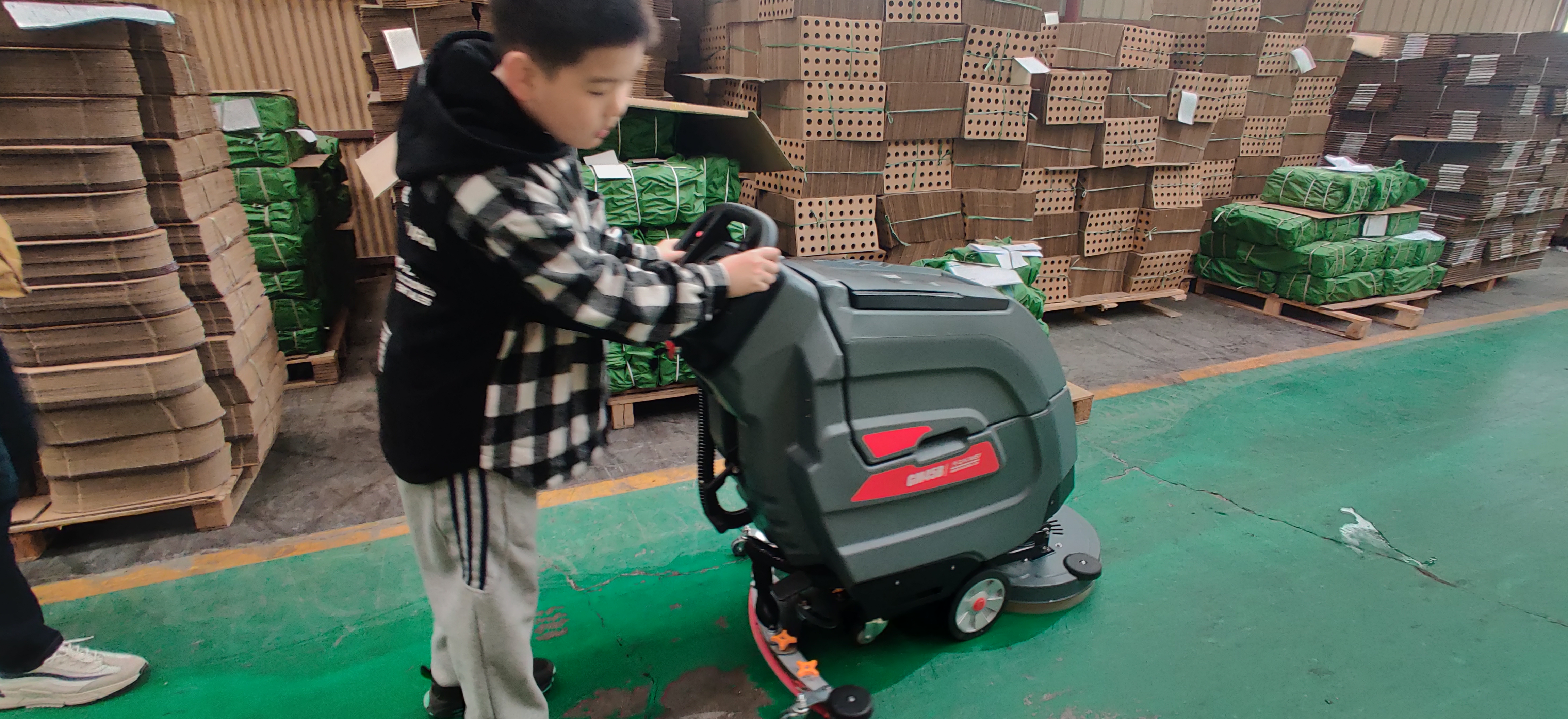 交货现场,小宝贝也要试试,可轻松操作清洗工厂车间地面。